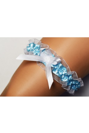 Dámský podvazek, který je vyrobený z puntíkovaného saténu a z jemného šifonu. Model je ozdobený saténovou puntíkovanou mašličkou a malou růžičkou.